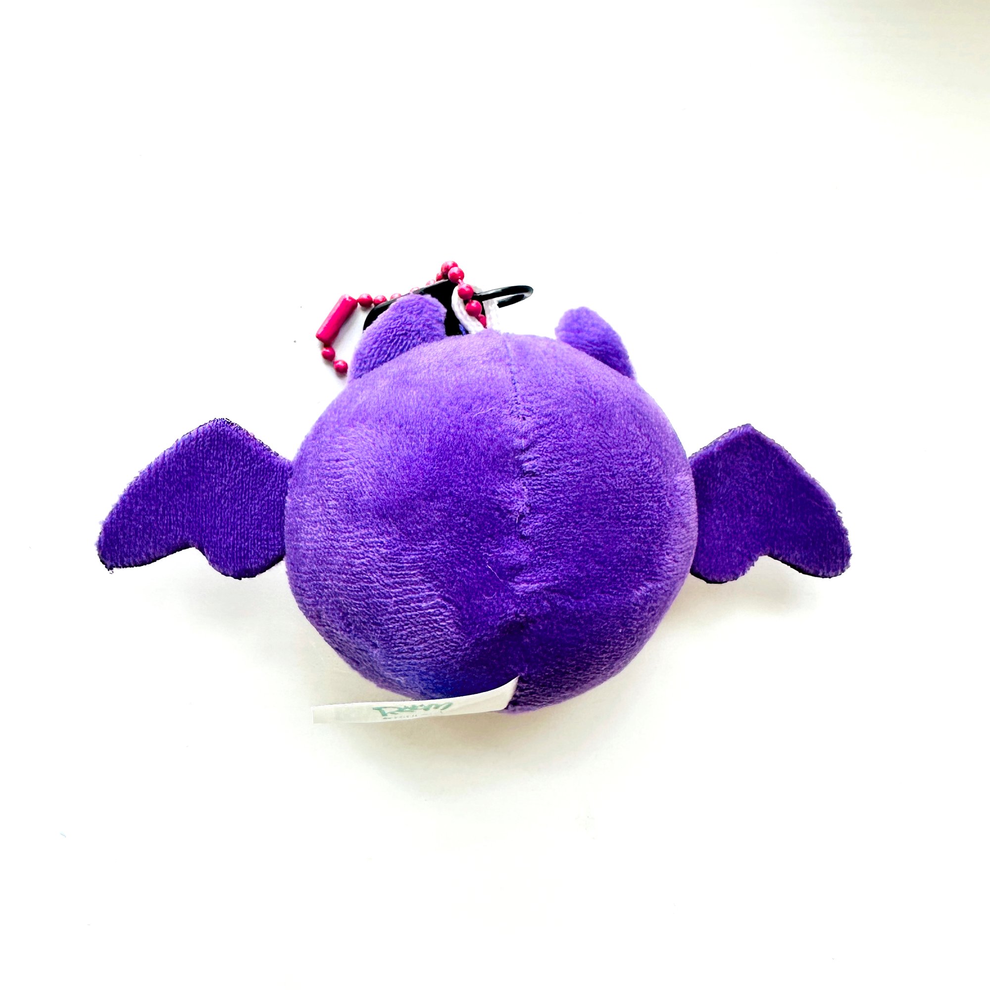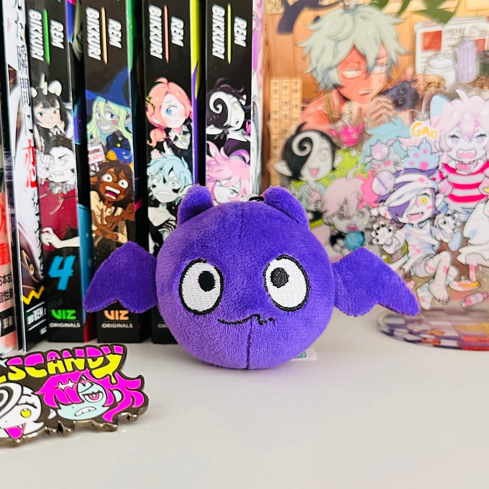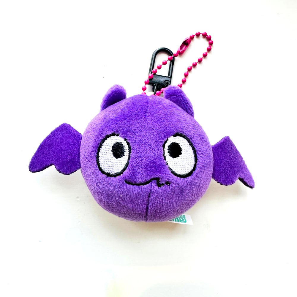 Tiny Hoffman the bat plush with keychain attachment.